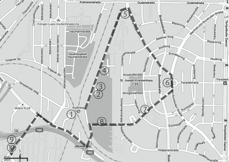 Am Südkreuz erwarten den Besucher zunächst viel grauer Beton und Asphalt zwischen Stadtautobahn und Möbelkaufhaus. Doch nur ein paar Schritte entfernt versteckt sich eine illustre Geschäftswelt hinter Kasernenfassaden, harren Zeugnisse einer wechselvollen Geschichte ihrer Entdeckung und lädt ein innerstädtisches Naturschutzgebiet zu ausgedehnten Wanderungen. Diese Station hat mehr zu bieten als nur Umsteigemöglichkeiten und IKEA.
