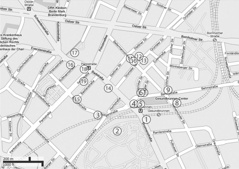 12. Grüntaler Promenade | Bis 1897 verlief die Bahnstrecke Berlin-Stettin auf dem Mittelstreifen der Grüntaler Straße durch den dicht bebauten Kiez. Die frühere Trasse wurde vor wenigen Jahren zu einer lang gestreckte Grünanlage mit Skulpturen und Spielplätzen umgestaltet | Grüntaler Straße