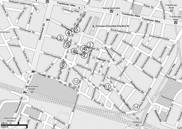 Am andern Ende der Simon-Dach liegt die Revaler Straße. Hier biegt man links ein und läuft an der überklebten und besprayten Mauer vorbei, hinter der sich eine Clublandschaft für lange Nächte verbirgt. An der Ecke zur Modersohnstraße liegt das alternative Wohnprojekt der Laster- und Hängerburg [12], die um ihren Fortbestand kämpft. Dann nach rechts auf die Modersohnbrücke, unter der die Bahnverkehrsströme von und zum Ostkreuz nur so dahin brausen. Der Panoramablick in Richtung Alexanderplatz mit seinem Gleisgewirr und der Hochhaus-Silhouette lässt großstadtromantische Gefühle aufkommen. Zum Sonnenuntergang trifft sich eine große Gemeinde aus Kiezbewohnern und -gästen, die für einen kurzen Moment die besondere Atmosphäre des Ortes genießt. Zurück zur Revalerstraße, geht es rechts bis zur Holteistraße. Der dortige Helenenhof [13] wurde von 1904 bis 1906 als eine der ersten Reformwohnanlagen Berlins erbaut; mit ihrem sozialen und hygienischen Anspruch stellte sie einen Gegenentwurf zu den weit verbreiteten Mietskasernen dar. Originalgetreu saniert lädt das aufwändig gestaltete Gebäude-Ensemble vor allem wegen seines parkähnlichen Innenhof zum Besuch ein. Von hier ist es nicht mehr weit, um vom Ostkreuz aus die Ringbahnreise fortzusetzen.