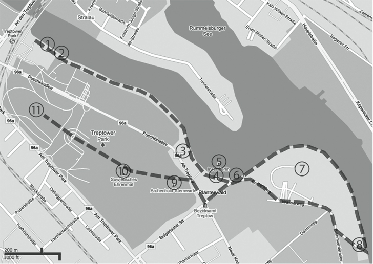 Willkommen in einer Welt, in der Dinosaurier, Plastikschwäne und gefallene Achterbahnen aus dem überwucherten Nichts auftauchen, ein traditionelles Ausflugslokal eine Burgerkette beheimatet und Zitate Josef Stalins die Sarkophage eines sowjetischen Ehrenmals zieren. Der Weg in die von Menschenhand geformte Natur führt vom Bahnsteig nach Süden in den Treptower Park hinein, der entlang der Spree verläuft. Hier liegt im Ausflugsdampferhafen ein Großteil der Weißen Flotte [1] Berlins und lädt zu Stadterkundungen auf dem Wasser ein. Zahlreiche kleine Cafés und Imbissstände versorgen die hungrigen Spaziergänger an Land. An der Promenade [2] entlang führt der Weg vorbei an großen Liegewiesen und schönem alten Baumbestand. Dann taucht hinter einer Flussbiegung das traditionsreiche Ausflugslokal Zennerhaus [3] mit seinem einladenden Biergarten auf. Ganz zeitgemäß birgt die Altberliner Institution in ihrem Untergeschoss einen Burger-Bräter US-amerikanischer Herkunft. Vorbei am Bootsverleih [4] fällt der Blick auf eine Brücke mit historisierenden Torhäusern aus dem Jahr 1915. Der ersten Stahlverbundbrücke Deutschlands sieht man diese technische Neuerung so gar nicht an. Gesäumt von Fachwerkaufgängen führt sie zur Insel der Jugend [5], ein lohnender Abstecher. Nicht weniger lohnend ist der selbst geräucherte Fisch, den man im Segelschiffrestaurant Klipper [6] zu sich nehmen kann. Zurück auf dem Festland geht es vom Wasser weg zum Spreepark [7], dem früheren "VEB Kulturpark Plänterwald", dessen schauerlich-schöne Fahrgeschäftsruinen eine wunderbare Kulisse für einen Sonntagsspaziergang in Berlin bilden. Umgeschmissene und kopflose Plaste-Dinosaurier zeugen von einer fernen Zeit, in der zehntausende Besucher ihre Freizeit auf den Fahrgeschäften des Vergnügungsparks verbrachten. Folgt man dem Poetensteig bis zum Wasserweg dämmert romantisch umwaldet das Eierhäuschen [8] vor sich hin. Der Weg biegt nach links in die Kiehnwerder Allee ab, es geht zurück in Richtung Spree, an der Insel der Jugend vorbei zur Puschkinallee. Auf der gegenüberliegenden Straßenseite reckt die Archenholdsternwarte [9] ihre „Himmelskanone" dem Universum entgegen – das längste bewegliche Linsenfernrohr der Welt. Hier hielt Albert Einstein 1915 seinen ersten öffentlichen Vortrag über die Relativitätstheorie in Berlin. Weiter die Puschkinallee hinauf erhebt sich ein imposantes Tor am Straßenrand. Der Triumphbogen bildet den Eingang zur monumentalen Ruhestätte von fünftausend sowjetischen Gefallenen des Zweiten Weltkrieges im Sowjetischen Ehrenmal [10]. Eine Lichtung am Ende des baumbestandenen Weges eröffnet den Blick auf zwei riesige stilisierte Fahnen aus rotem Granit, dahinter führt eine Treppe hinunter zum Ehrenhain mit seinem Gräberfeld. Sechzehn große Marmor-Sarkophage tragen Zitate Stalins und Reliefs, in denen der Kampf der Roten Armee im „Vaterländischen Krieg" dargestellt wird. Die bronzene Monumentalfigur auf dem Mausoleumshügel wirkt in ihrem martialischen Auftritt geradezu dinosaurierhaft. Über die breite Zugangsallee geht es zurück zur Puschkinallee und zum nahen Ringbahnhof am Treptower Park [11], von wo aus die Reise nach einer kurzen Rast auf der von alten Bäumen gesäumten Liegewiese weitergeht.