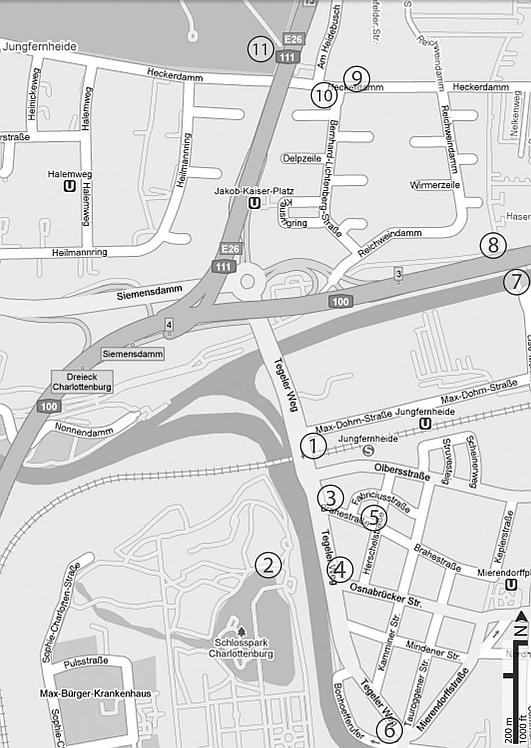 1. Ringbahn-Brücke | The pedestrian overpass runs alongside the tracks, crossing over the Spree into Charlottenburg’s Schlosspark. Stairways are on both sides of Tegeler Weg | Tegeler Weg, corner of Olberstraße
